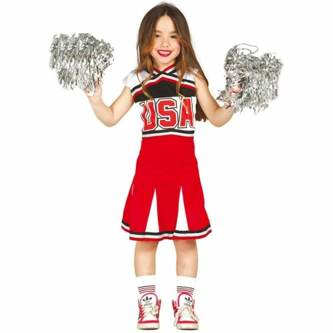 Éxito asegurado en cualquier evento deportivo. Este disfraz de animadora o cheerleader para niña, combina perfectamente los tonos blancos y rojos para hacer un disfraz realmente bonito y muy útil para festivales de colegio. Este modelo además está totalmente americanizado con las letras USA en grande. Pompones disponibles en nuestra web.