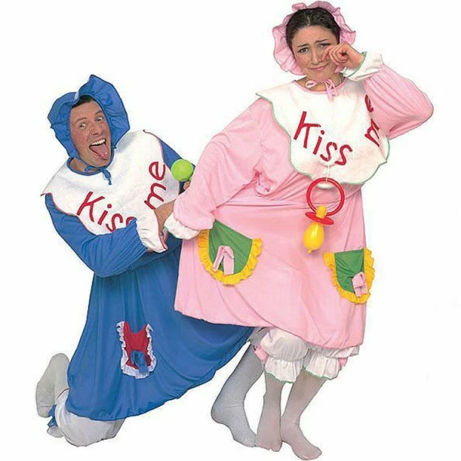 Simpático disfraz de bebé, disponible en dos colores para despedidas o carnaval. Vuelve a los tiempos de pañales y biberones con este divertido disfraz. ¿Quién será el lanzado que te cantará una nana?