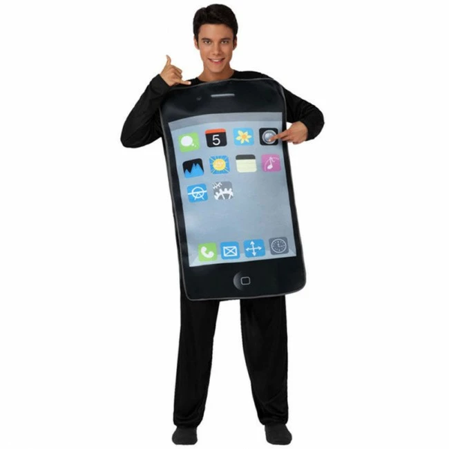 El disfraz ideal para ir a la última en vuestra próxima fiesta de disfraces. La mejor forma de no desconectar en ningún momento y conseguir el número de teléfono de alguien es gracias a este original y simpático disfraz de teléfono smartphone.
