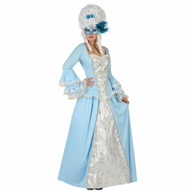 Si tuviéramos que definir con solo dos adjetivos nuestro nuevo disfraz de Noble Veneciana para señora, sin duda estos serían: Original y Lujoso. Excelentes acabados para un nuevo modelo que se incorpora a nuestra categoría de disfraces de época y venecianos. Perfecta combinación de tono azul claro y blanco para este vestido de cortesana de época. Disponible también la versión masculina para ir a juego con vuestra pareja.